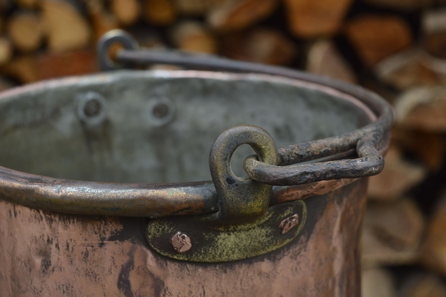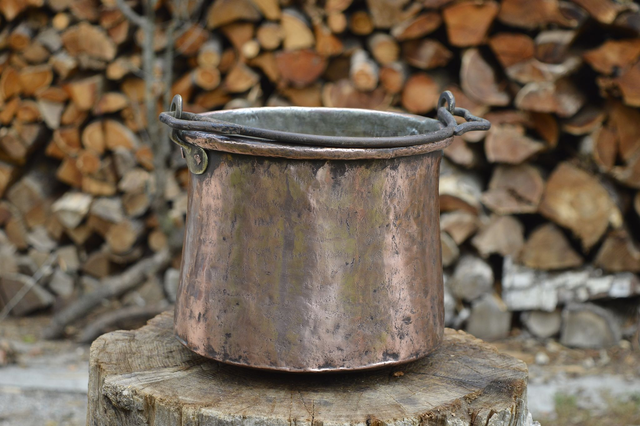 Antique copper bucket with wrought iron handle and bronze ears, once used to draw water from a well or river, then boiled over an open fire for drinking or cooking. Carefully restored by skilled hands, it retains the marks of time—each dent and patina a whisper of rural life, of early mornings and simple rituals. This vintage piece isn’t just a container; it’s a storyteller. It speaks of a world where water was gathered with care, meals were made from scratch, and every tool had a soul. Today, it lives on as a decorative treasure, carrying the warmth and authenticity of a bygone era.
