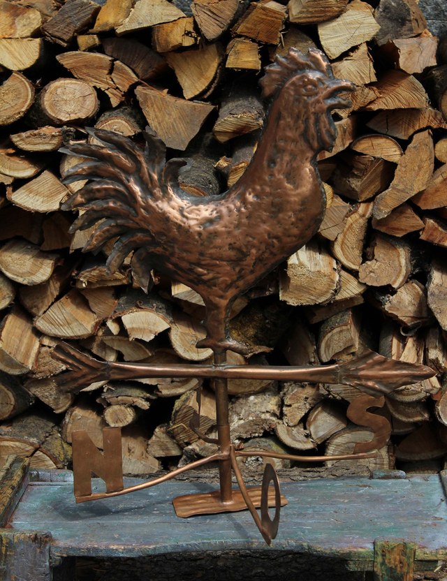 A one-of-a-kind weathervane rooster, with dedicated cardinal points, crafted exclusively by hand using ancient coppersmithing techniques.