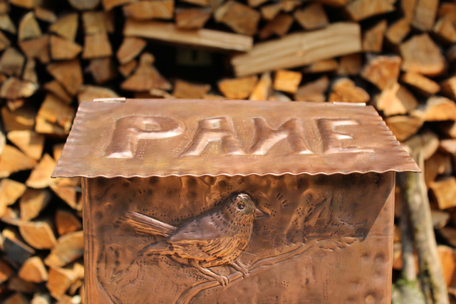Made entirely by hand, following ancient copper working arts, this object can be an original alternative to receive our bread, otherwise in the version without writing, perfect for receiving parcels or mail in general.