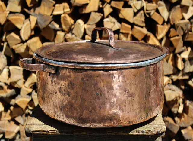 Grande pentola rotonda in rame fatta a mano .